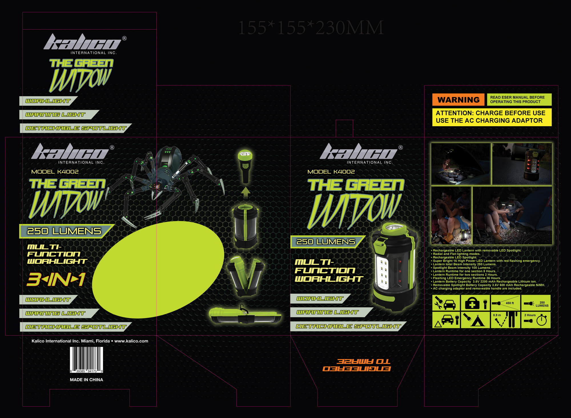 This box has a window (green oval) to show material and construction of the actual product inside of the box. In the front the package mentions this product functions and versatility while it shows the product. In the other side 4 pictures illustrate how to open the lantern and use it as a lamp. They also show how to take out the flashlight. I took the pictures of the lantern in all its positions and the action shots of the Green Widow in the back of the packaging. Printed on high gloss cardboard and silver foil on logo, “The Green Widow”, picture of the product and spider.