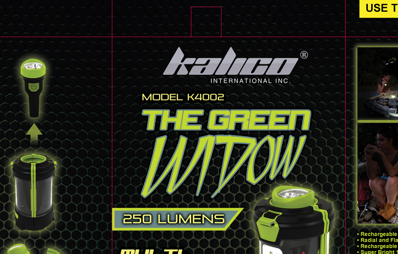 Kalico is one the company that sells Green Widow. This product is a multi-functional lantern that can be used as a signal light and a flash light as well. Its name comes from the shape it creates when hangs from a tree. Camping, outdoor and mechanic are the applications for Green Widow.