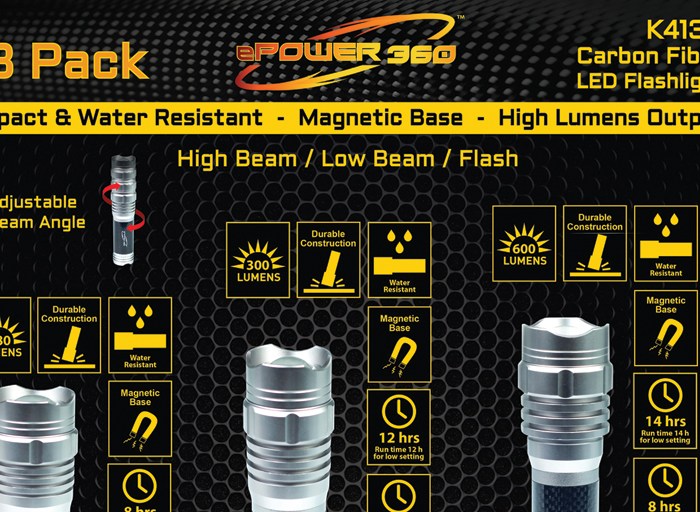 ePower360 3 Pack Carbon Fiber Flashlight Packaging 2016